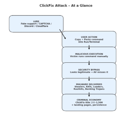 The popularity of ClickFix has grown rapidly because of its flexibility and its ability to evade security tools. Threat actors have broadened the lures: fake Cloudflare Turnstile pages, Discord server verifications, even supposed technical fixes. In each case, the victim is manipulated into copying and running commands in Windows PowerShell, Windows Terminal, or macOS Terminal. Because the action is initiated by the user rather than an automated exploit, traditional defenses often do not flag the behavior. Microsoft notes that this is why ClickFix consistently slips past automated detection. It is distributed through common channels—phishing, malvertising, drive-by compromises—while impersonating legitimate brands to reduce suspicion. Once the foothold is established, a wide range of malware families can be delivered: information stealers like Lumma, RATs including Xworm, AsyncRAT, NetSupport RAT, and SectopRAT, loaders such as Latrodectus and MintsLoader, rootkits like r77, and banking trojans including Lampion.