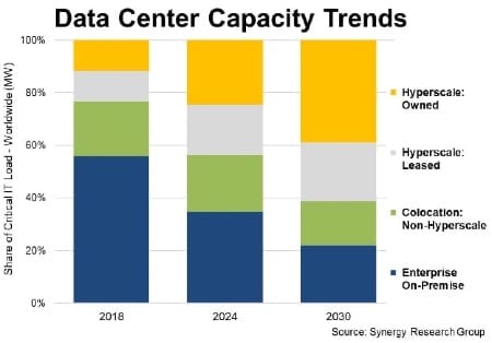 Hyperscale operators now run 1,189 facilities worldwide, accounting for 44 percent of global data-center capacity. By 2030, their share is projected to grow to 61 percent, while colocation and on-premise enterprise sites will shrink in relative terms (see Table 1).