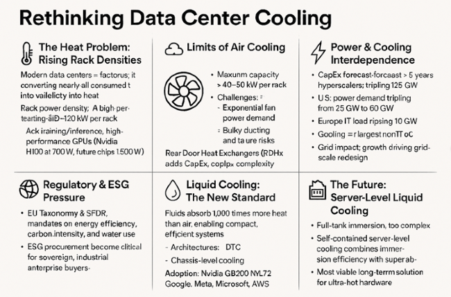 At the same time, data-center electricity demand is set to triple in the U.S. (from 25 GW to 80 GW) and more than triple in Europe (from 10 GW to 35 GW) over the next five years. Regulatory regimes such as the EU Taxonomy for Sustainable Activities and the Sustainable Finance Disclosure Regulation now mandate strict targets for energy efficiency, carbon emissions, and water use. Against this backdrop, incremental tweaks to air-based systems no longer suffice—data centers must adopt transformative cooling technologies to sustain AI-driven growth without breaching environmental or economic limits.