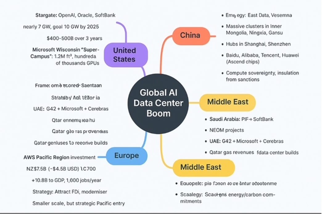 From Wellington to Wisconsin, Shanghai to Riyadh, the AI boom is no longer about apps or models, but about the physical infrastructure to host them. The U.S. leads in scale and speed, building multi-gigawatt campuses with Nvidia racks shipping by the truckload. China is pursuing sovereignty with its East Data, West Compute model, circumventing export restrictions. The Gulf states are buying their way into the race with sovereign capital, while Europe cautiously balances ambition with regulation. Even smaller economies like New Zealand are retooling laws to attract foreign tech giants. The new geopolitics of AI is built in concrete, powered by gigawatts, cooled by water and air, and financed in the hundreds of billions. Whoever controls the data centers controls the future of artificial intelligence—not in theory, but in steel, silicon, and electricity.